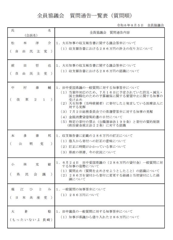 せめて今日の全員協議会の質問くらい、大石知事(ヨゴレ)に寄り添うのではなく、長崎県民に寄り添った真摯な質問をしないと、長崎県民の怒りは爆発し、自民党長崎県連に未来はない。